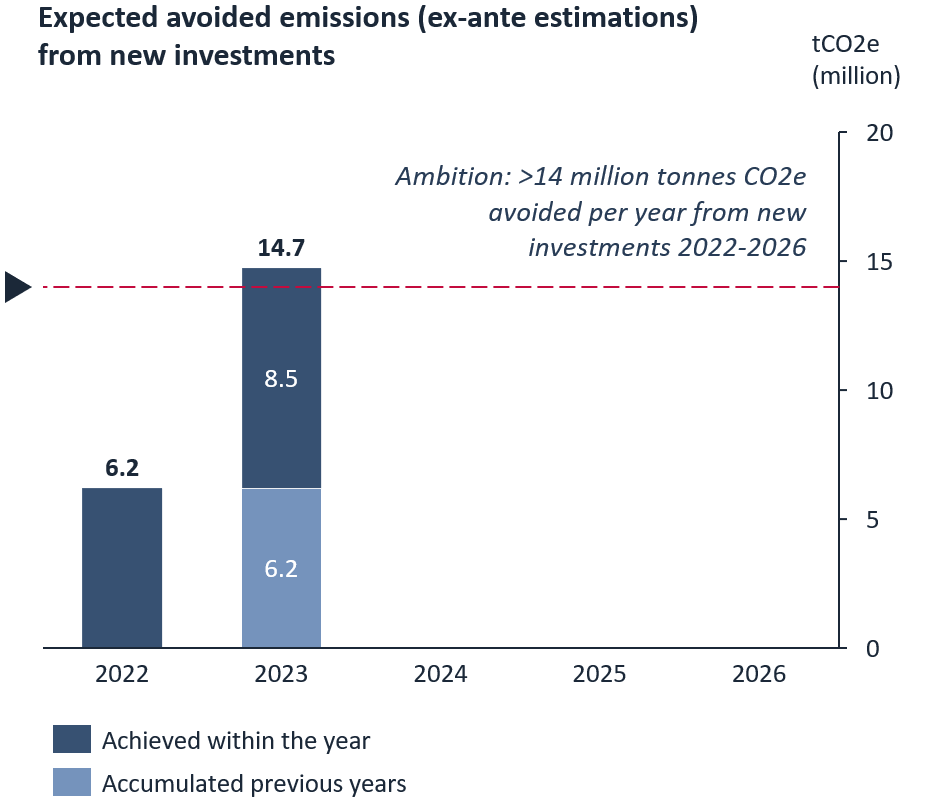 In 2023, portfolio companies under the climate mandate produced renewable energy corresponding to annual avoided emissions of 5.8 million tons of CO2e. Of this, 2.2 million tons of CO2e were avoided by greenfield projects.