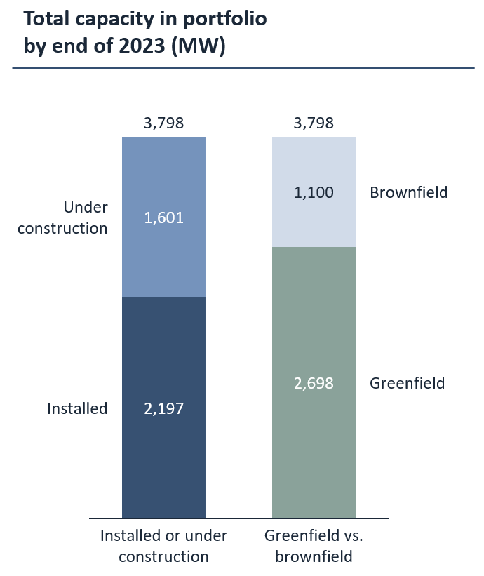 As of 31.12.2023, the total capacity in Norfund’s portfolio companies was 3,798 MW, of which 2,197 MW was installed and 1,601 MW was under construction. Of this, Norfund has helped finance the construction of 2,698 MW (greenfield*). Most of the capacity financed in 2023 has yet to reach construction and so the total capacity in the portfolio is expected to increase significantly.