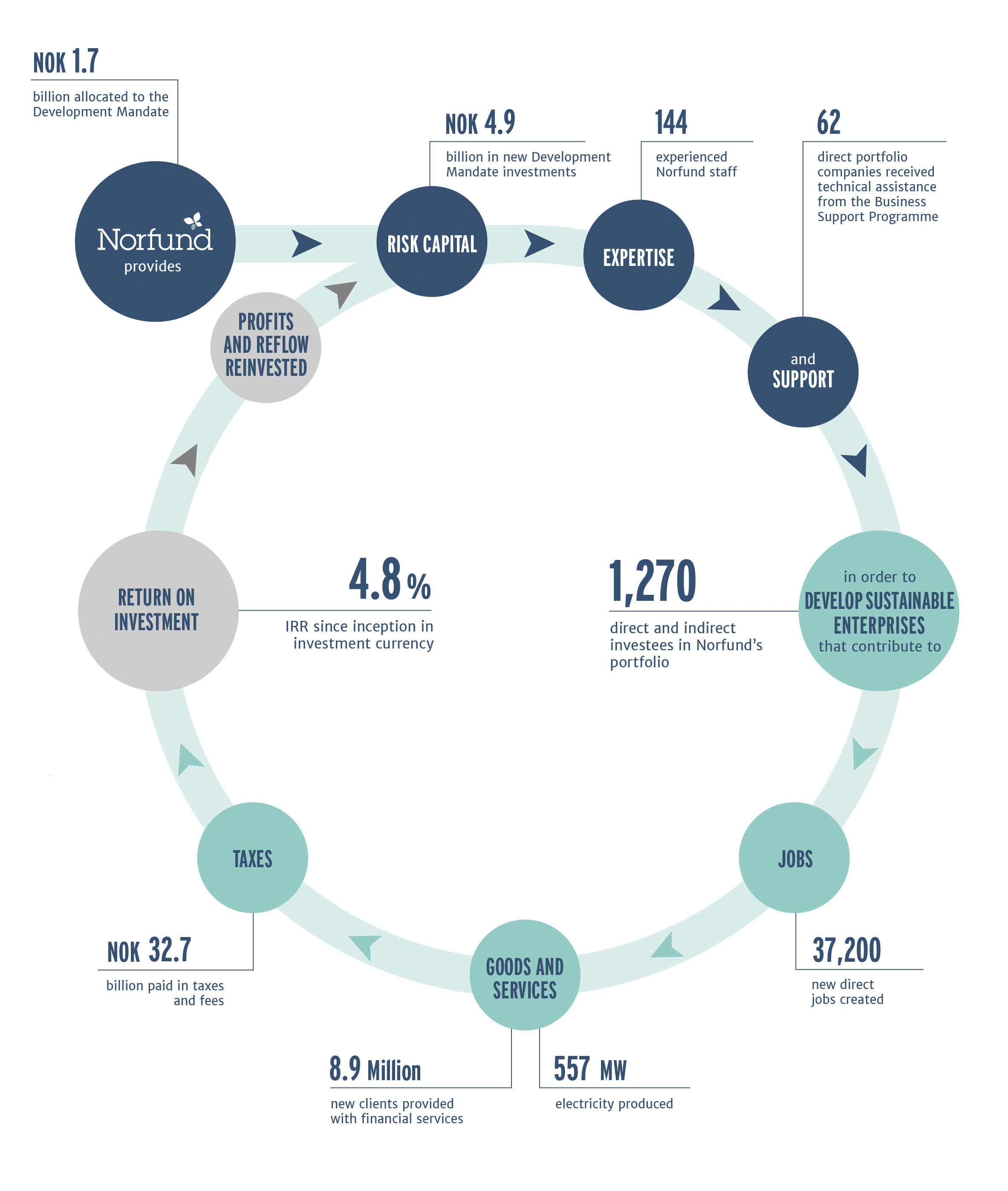 The diagram below illustrates Norfund’s operations and impact in 2023, showcasing the efforts in job creation, expanding energy accessibility, and advancing financial inclusion. Investments are strategically exited once they no longer require additional support, with the proceeds reinvested in enterprises that have a greater need for risk capital. This ensures a continuous cycle of impact and sustainable development in the specified areas.