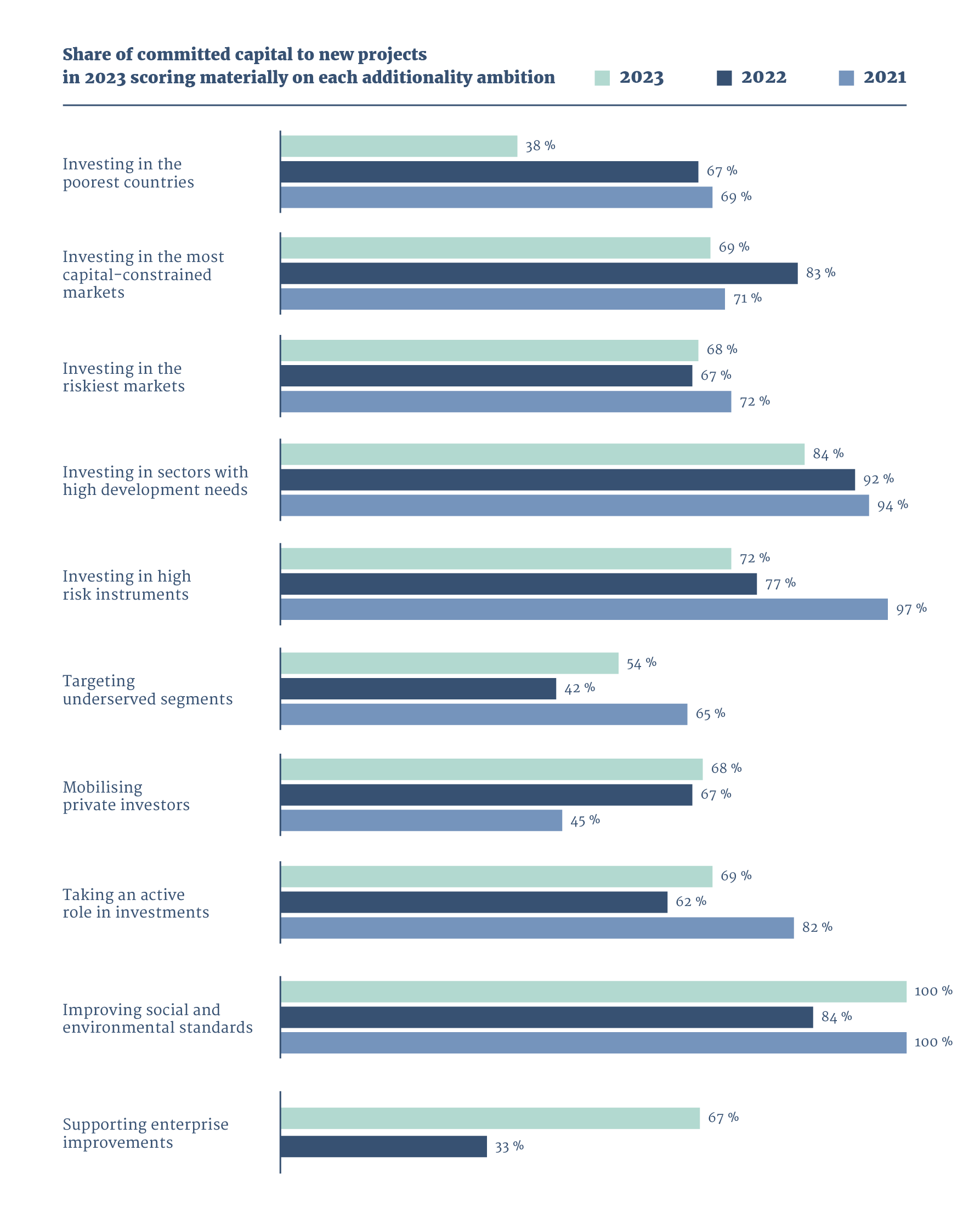 The framework informs our investment decisions and the way we report on additionality. Each new potential investment is assessed against the ten ambitions, explained in the graph below, and is accompanied by a narrative description of additionality. More information on which ambitions each investment is particularly additional on, is listed on the individual investment webpages on the Norfund website.