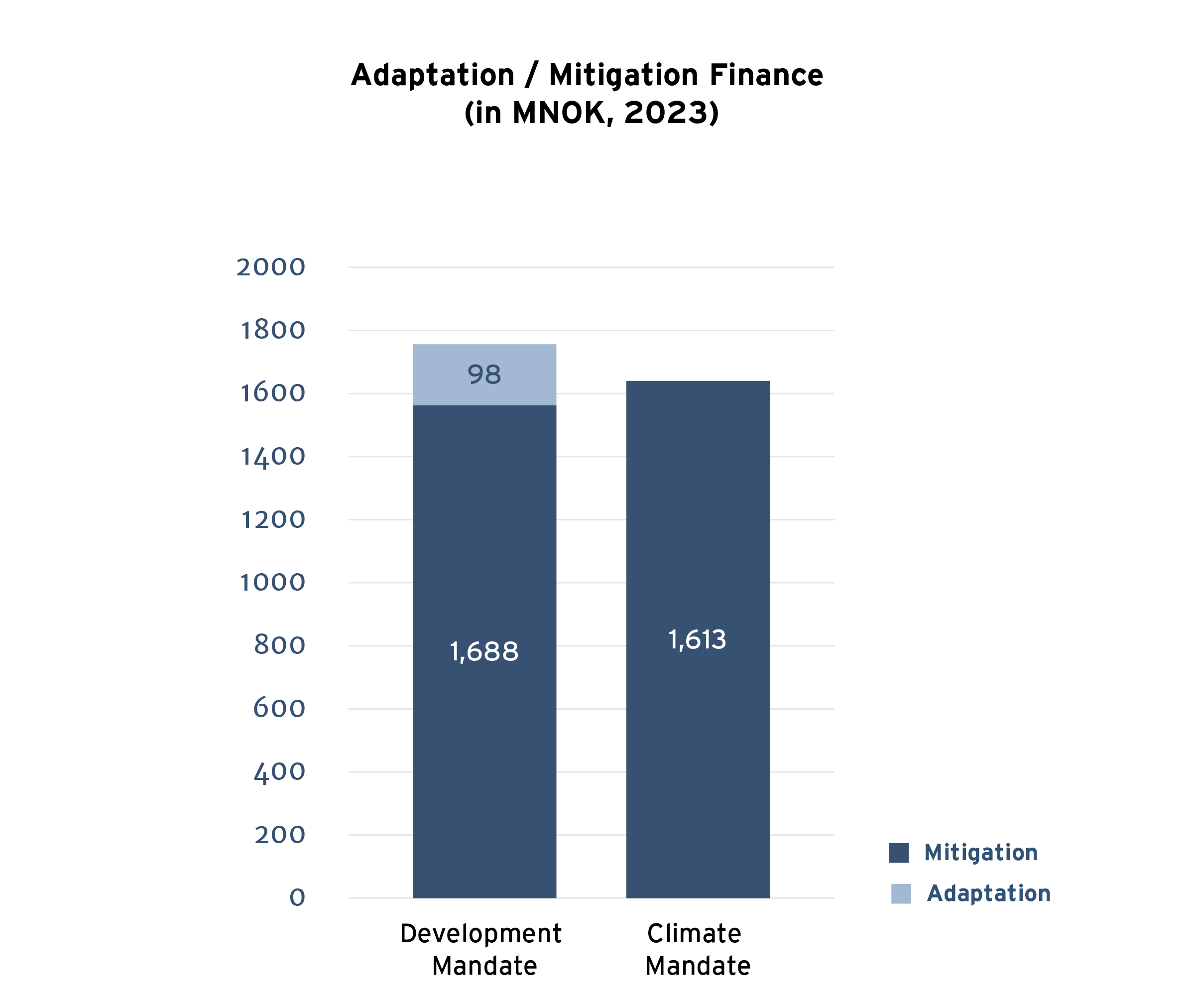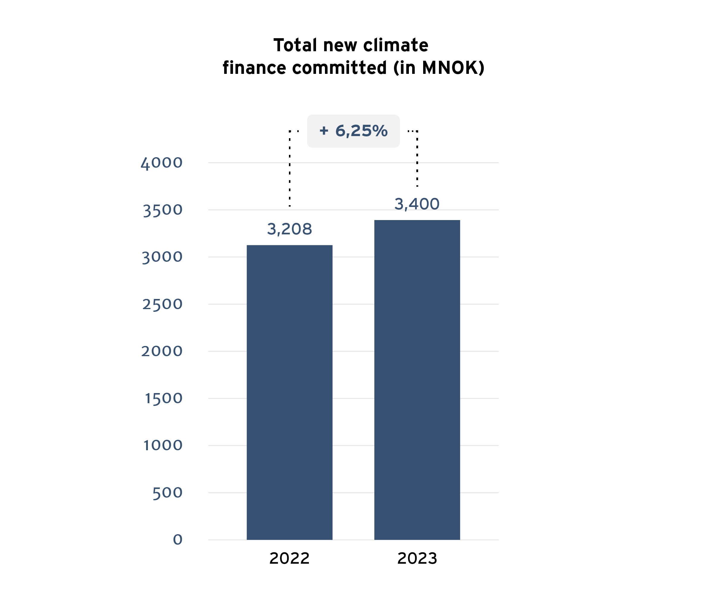 Climate finance refers to the financial investments mobilized to support climate change mitigation and adaptation projects, aiming to reduce emissions and adapt to climate impacts. The criteria used to assess climate finance at Norfund are defined in the IDC/MDB’s Common Principles for Climate Mitigation Finance Tracking, and The MDB’s Joint Methodology for Tracking Climate Change Adaptation Finance. Norfund increased its climate finance commitments in 2023 by 6.25% compared to 2022 totaling to almost 3,5 billion NOK. As explained above, climate finance is also an integral part of our net zero strategy.