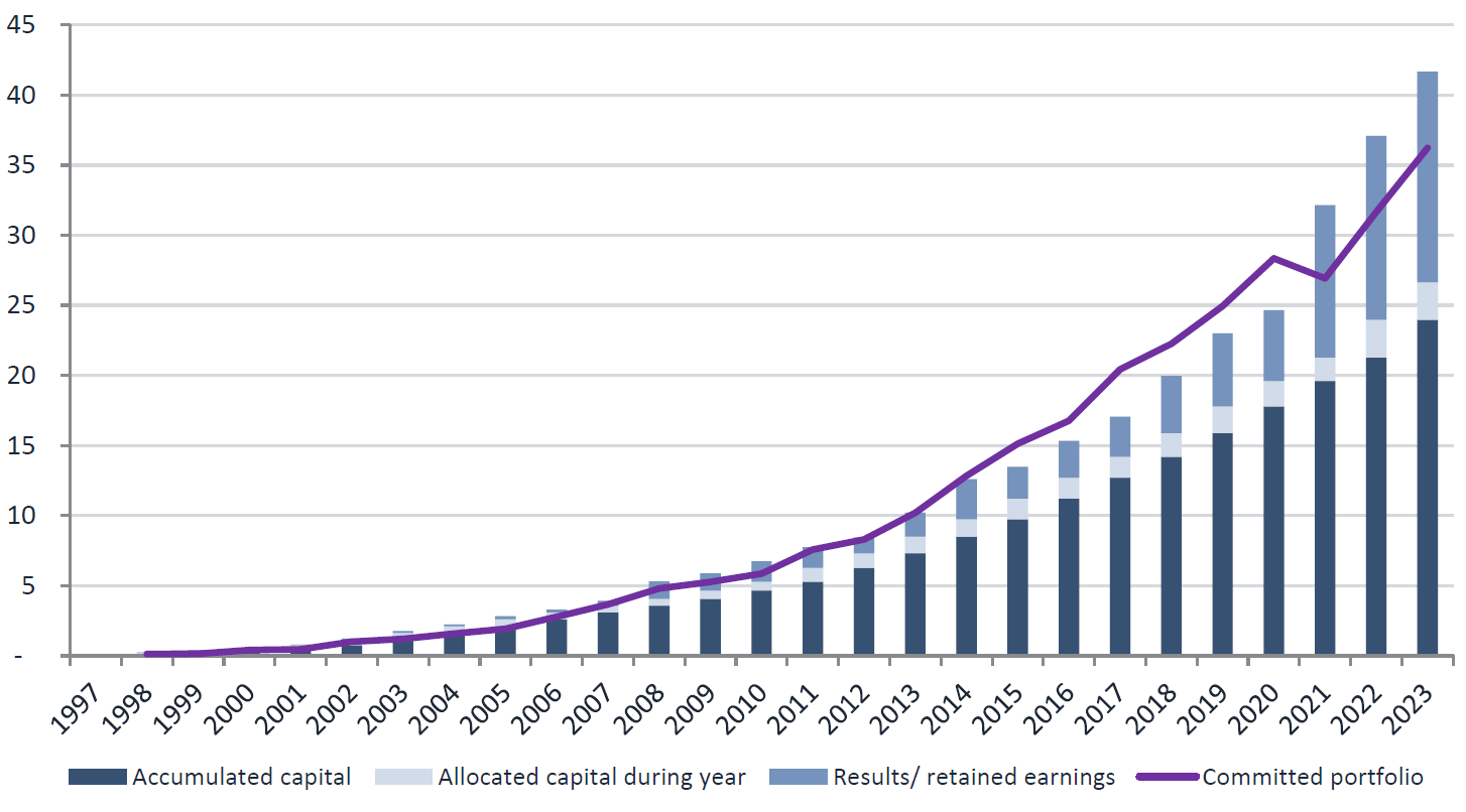 Norfund’s total committed portfolio of 36.2 billion NOK by year end of 2023, consists of 230 direct investees and 1030 indirect investees. Out of the total committed portfolio, 3.76 billion NOK and 12 of the investees were under the Climate Mandate. During 2023, Norfund made a total of 26 new investments and 19 follow-on investments.