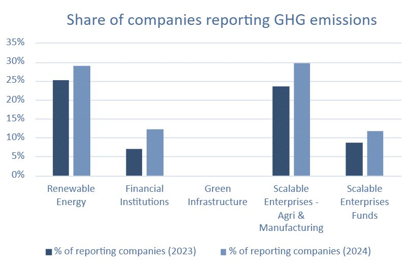 In 2024, Norfund saw a 34% increase in the number of companies reporting GHG emissions. Of the 213 companies that reported emissions for 2024, 24% of companies reduced their emissions compared to 2023 numbers. Still, there is a need to increase the share of companies reporting emissions.