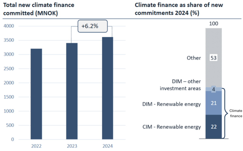 Progress: Climate finance refers to the financial investments to support climate change mitigation and adaptation projects, to reduce emissions and adapt to climate impacts. The criteria used to assess climate finance at Norfund are defined in the IDC/MDB’s Common Principles for Climate Mitigation Finance Tracking, and The MDB’s Joint Methodology for Tracking Climate Change Adaptation Finance. In absolute figures, Norfund increased its climate finance commitments in 2024 by 6.2% compared to 2023, totaling to 3.6 billion NOK. However, relative to new investments, the share fell to 47%, from 52% in 2023, and a step-up is needed to reach the ambition of 64% climate finance as set out in the Net Zero strategy. Renewable energy (both development mandate and climate mandate) represents most of the climate finance, while the other investment areas accounted for 3.5 % of total new investments. Additionally, Norfund mobilized 5.87 billion NOK in private capital in the climate finance commitments in 2024.