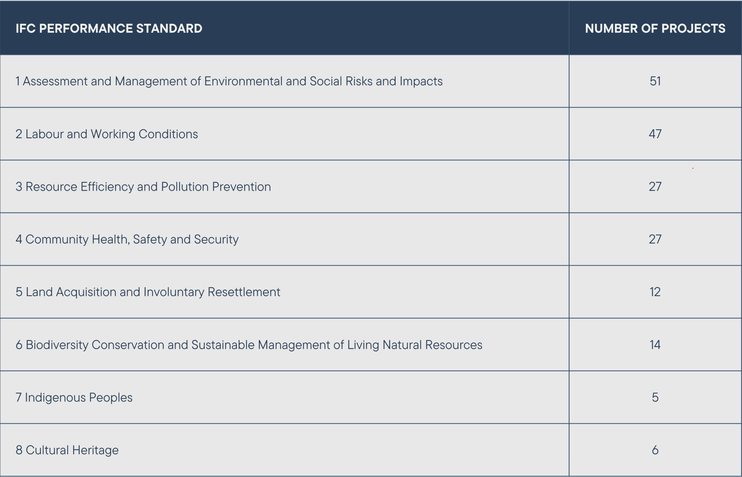 The IFC Performance Standards for Environmental and Social Sustainability and the World Bank Group Environmental, Health and Safety Guidelines are the main standards for operationalizing Norfund’s sustainability commitments. These standards are globally recognized benchmarks for environmental and social risk management in the private sector. The standards are used by development finance institutions, commercial banks and other similar institutions. The table below outlines the eight Performance Standards and the extent to which they were triggered by the projects we invested in during 2024.