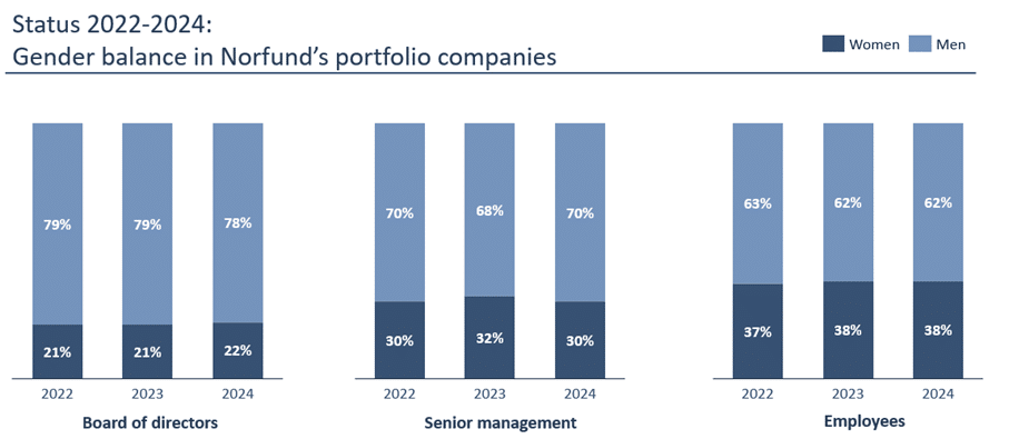 Furthermore, during 2024, we continued our collaboration with the Nordic DFIs, IFU (DK), Swedfund (SE) and Finnfund (FI), on gender equality by sharing and learning as well as exploring collaboration on work related to gender equality within investees in which we have co-invested.
