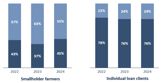 Expanding access to finance for women is one of the most effective ways our investments contribute to greater gender equality. The majority of individual loan clients reached through our investments are women. These services are delivered through different types of financial institutions, including large banks, microfinance institutions, many of which primarily serve female customers, and companies in the financial technology sector.